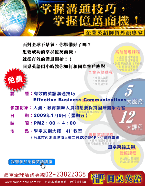 首頁/產業資訊訊息列表/內湖免費英語講座 即將額滿!!! 內湖免費英語講座 即將額滿!!! 內湖免費英語講座 即將額滿!!! 2009年1月9日 PM2:00~4:00 內湖免費英語講座 即將額滿 報名從速!!! 詢價留言 您好,如有任何詢價需求,請善用這裡的【詢價留言】我們在收到您的留言時,會盡快處理及回覆! 詢價需求 需求說明 認證碼 同步成為台灣黃頁詢價供應商。 公司名稱統編 姓名電話 e-mail To: 圓桌英語 聯絡人:孫** Email:ee******@roundtable.com.tw 詢價回覆率:42% 送出詢價 https://bao-yi.web66.com.tw/web/News?postId=1333949松禾鐵板燒料理 松禾鐵板燒料理